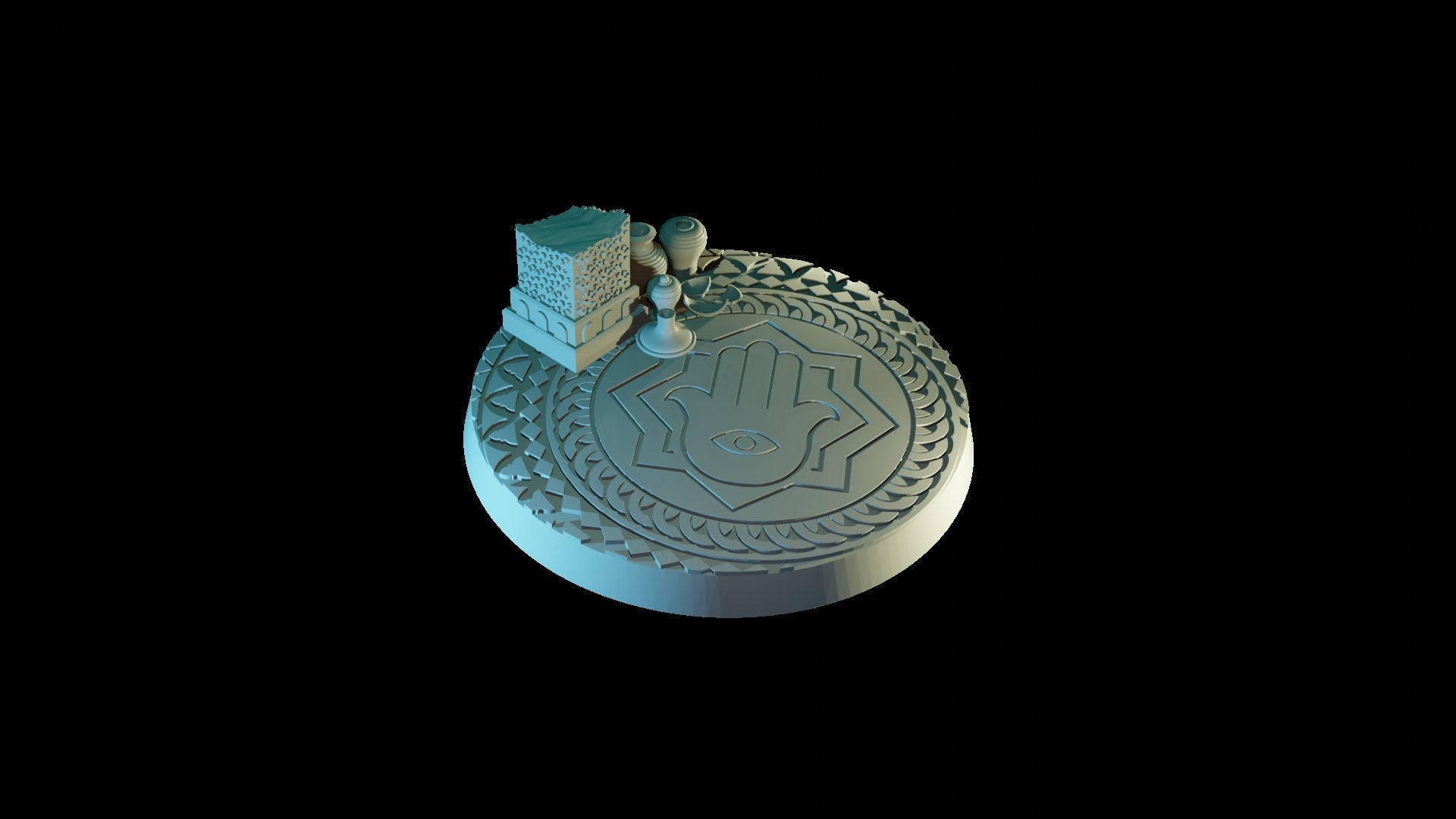 Exceptional detailed Arabian Nights (Hand of Fatima 50 mm) Base, which were created by the amazing artist Casper Gad and were acquired via kickstarter (https://www.kickstarter.com/projects/basicaiddesign/more-than-100-designs-to-base-your-miniatures).
