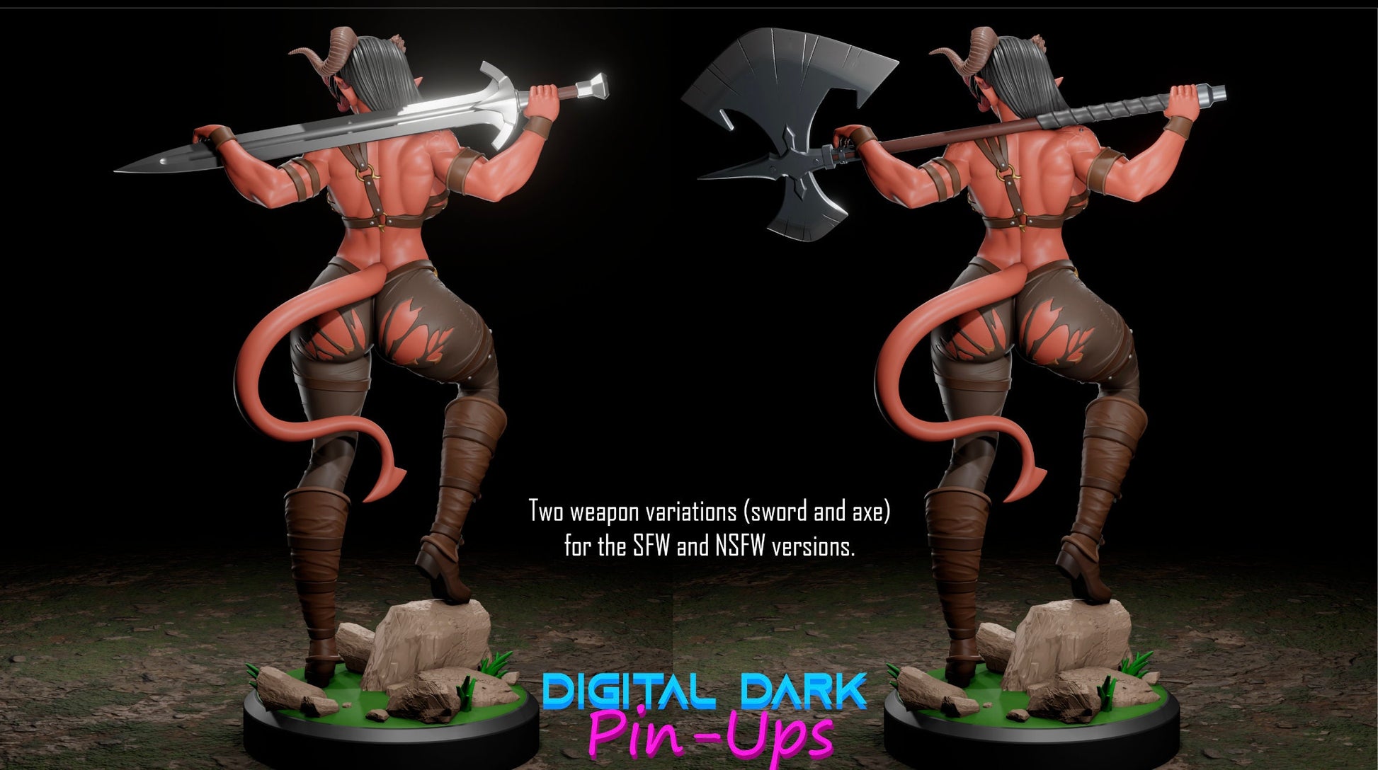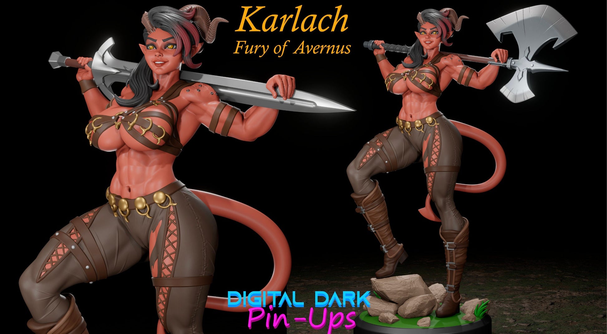 Exceptional detailed pin up Karlach with various outfits for your dnd encounters as well as a tabletop scenery or even a collector's piece, which were created by Created by "digital dark pin up" and were acquired via patreon, with the merchant ability to sell physical products of their designs