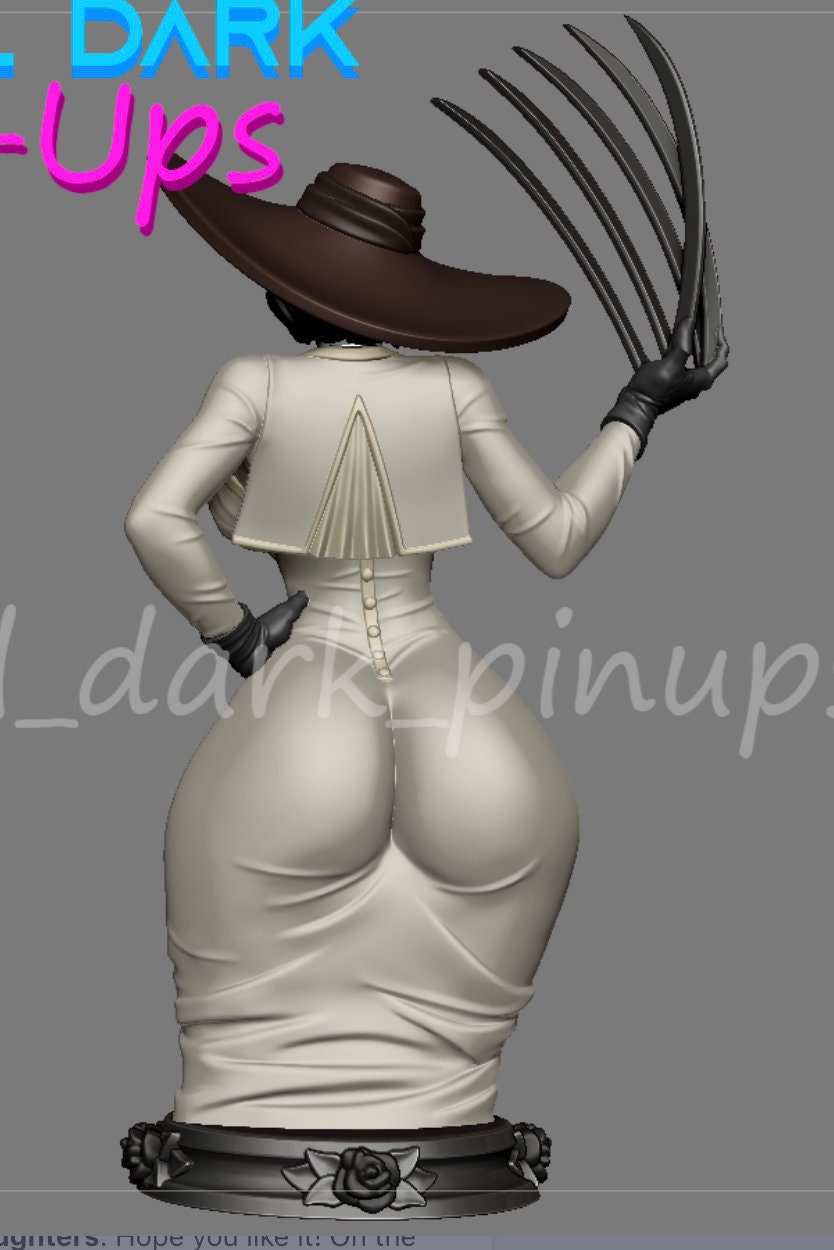 Exceptionally detailed pin up lady Dimitrescu from resident evil with various outfits for your dnd encounters as well as a tabletop scenery or even a collector's piece, which were created by Created by "digital dark pin up" and were acquired via patreon, with the merchant ability to sell physical products of their designs
